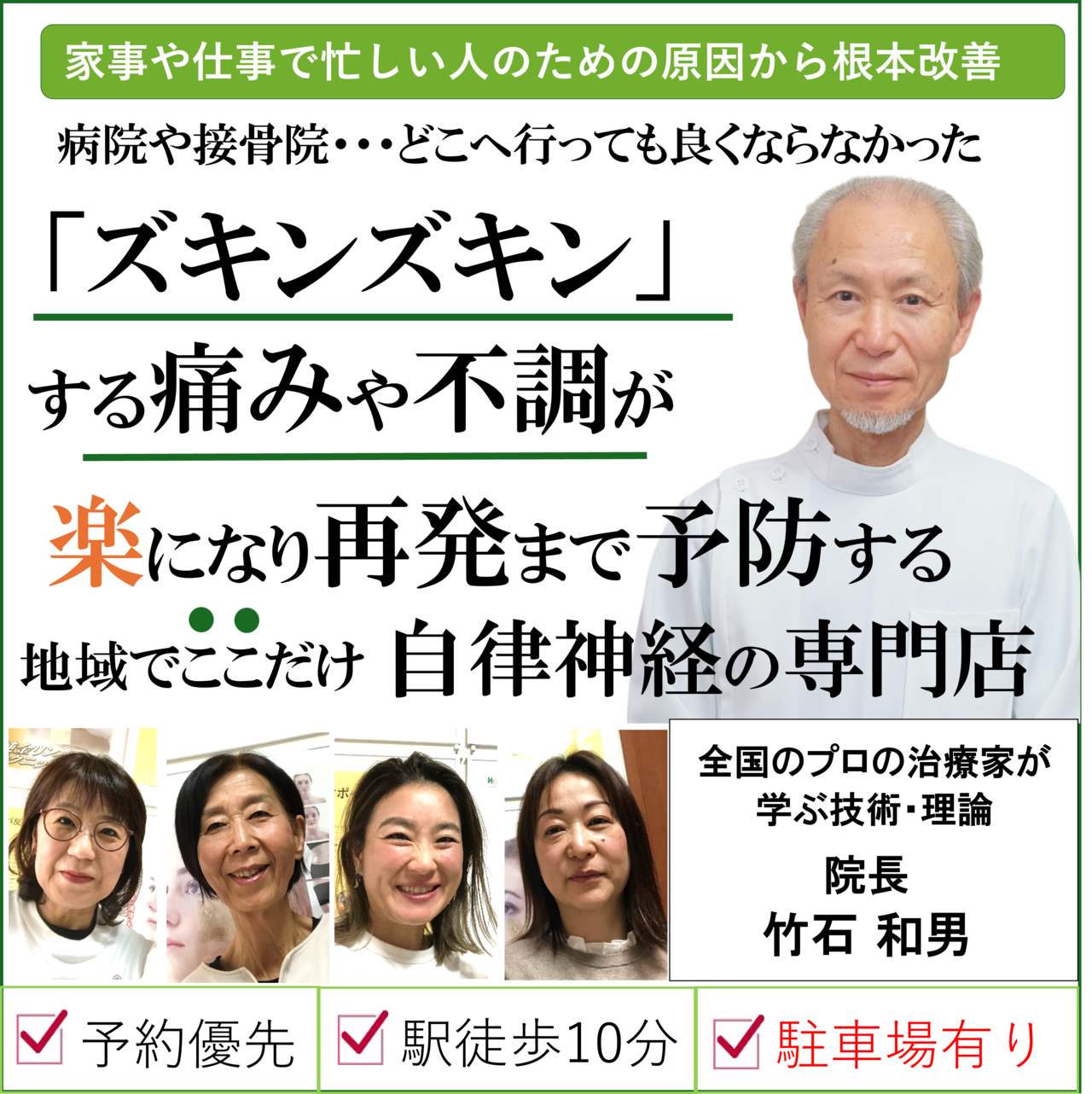 そのいずれも痛い場所ばかりを追って、全身の正常な活動に不可欠な「自律神経」に着目せずに体の歪みだけを原因にしています。体の歪みのほとんどは「筋肉」「内臓」「循環」などをコントロールする「自律神経の乱れ」という事実を基に生み出された、独自の理論が当院の施術です。これを受ける事ができるところは全国でも数少ないのです。