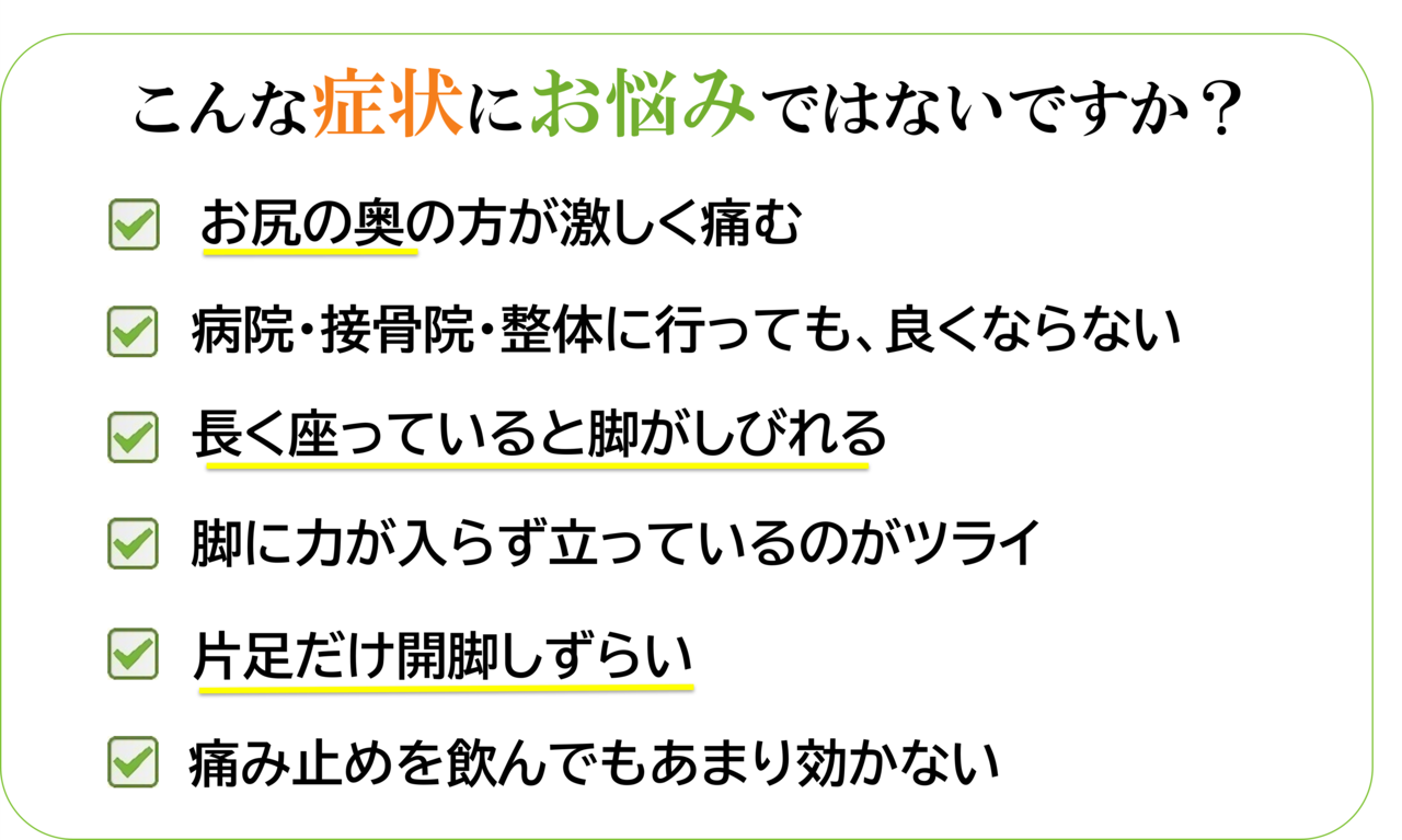 「お尻の奥がズーンと痛い」「長く座っていると脚がしびれる」「腰というより、お尻から太ももにかけてつらい」こんな不調ありませんか?