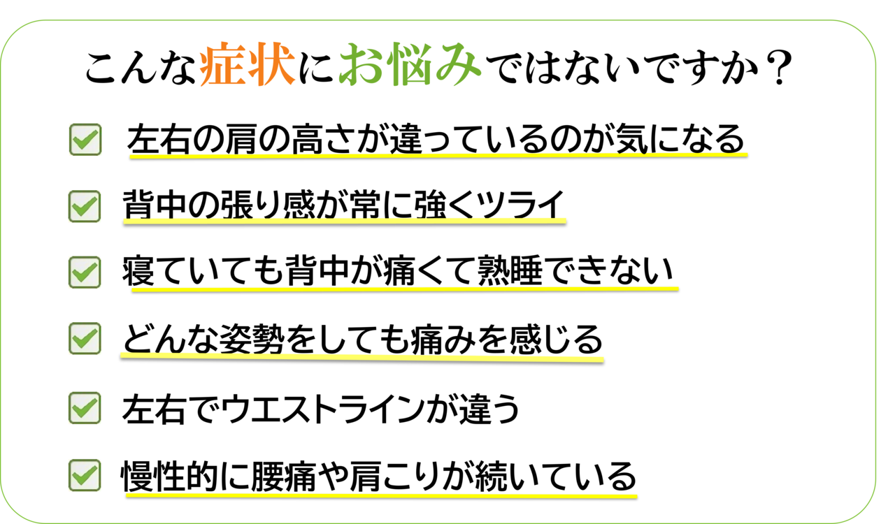 側弯症は、背骨を整えるだけでは全く改善しません。背骨の土台である骨盤の歪みを整えなければ背骨を支えている筋肉の緊張も無くなりません。まずは、骨盤をしっかり整え背骨と背骨を支える筋肉のケアをしていくことで、以下のような効果を目指します。