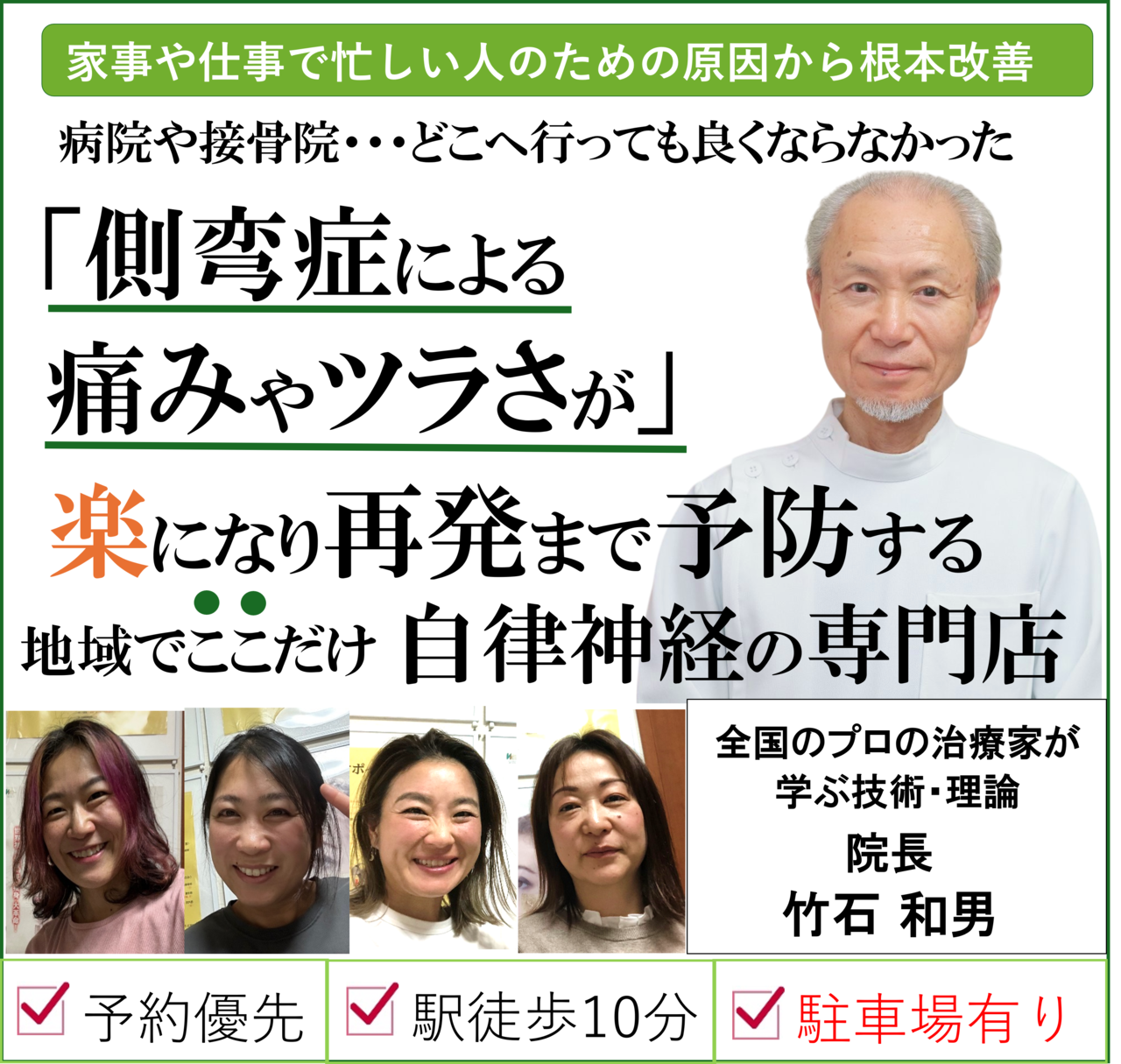 そのいずれも痛い場所ばかりを追って、全身の正常な活動に不可欠な「自律神経」に着目せずに体の歪みだけを原因にしています。体の歪みのほとんどは「筋肉」「内臓」「循環」などをコントロールする「自律神経の乱れ」という事実を基に生み出された、独自の理論が当院の施術です。これを受ける事ができるところは全国でも数少ないのです。
